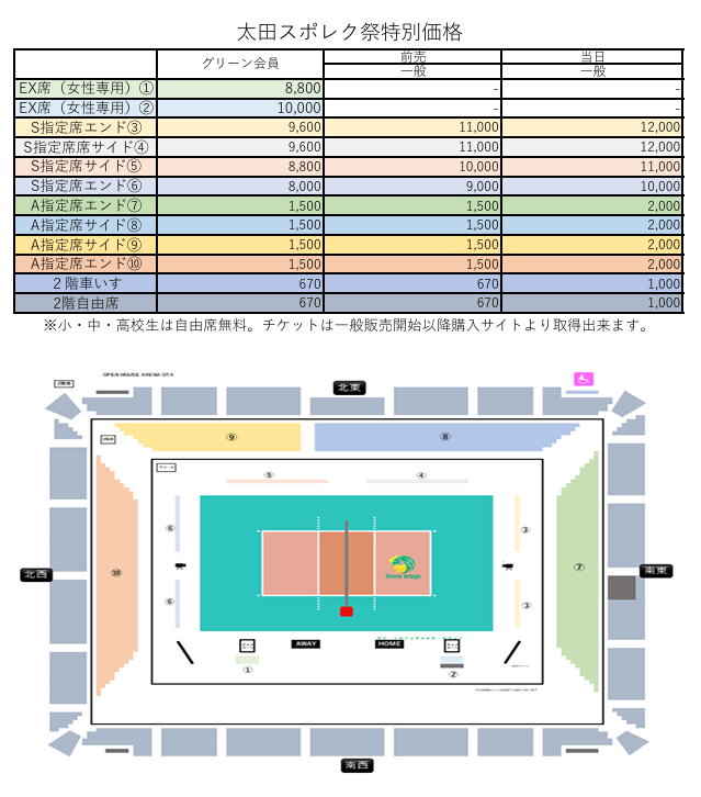 10月25日(土)、26日(日)オープンハウスアリーナ太田で開催される対PFUブルーキャッツ石川戦は、太田スポレク特別価格をご用意いたしました。2階自由席はもちろんのこと1階A指定席もよりお手頃な価格でご提供をさせていただきました。指定席でゆったり、プロのバレーボール選手の戦いをご堪能下さい。さらに高校生以下は自由席での観戦は無料といたしました。ご家族でオープンハウスアリーナ太田で戦う群馬グリーンウイングスへの応援よろしくお願いいたします。