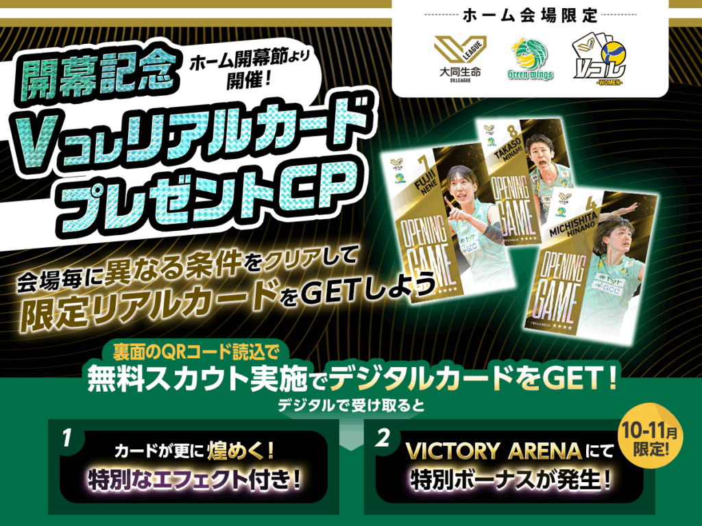 2025-26 大同生命SV.LEAGUE 開幕を記念して群馬グリーンウイングスでは2025年10月18日(土)・19日(日)NECレッドロケッツ川崎戦(会場:ヤマト市民体育館前橋)にてVコレリアルカードを配布いたします。