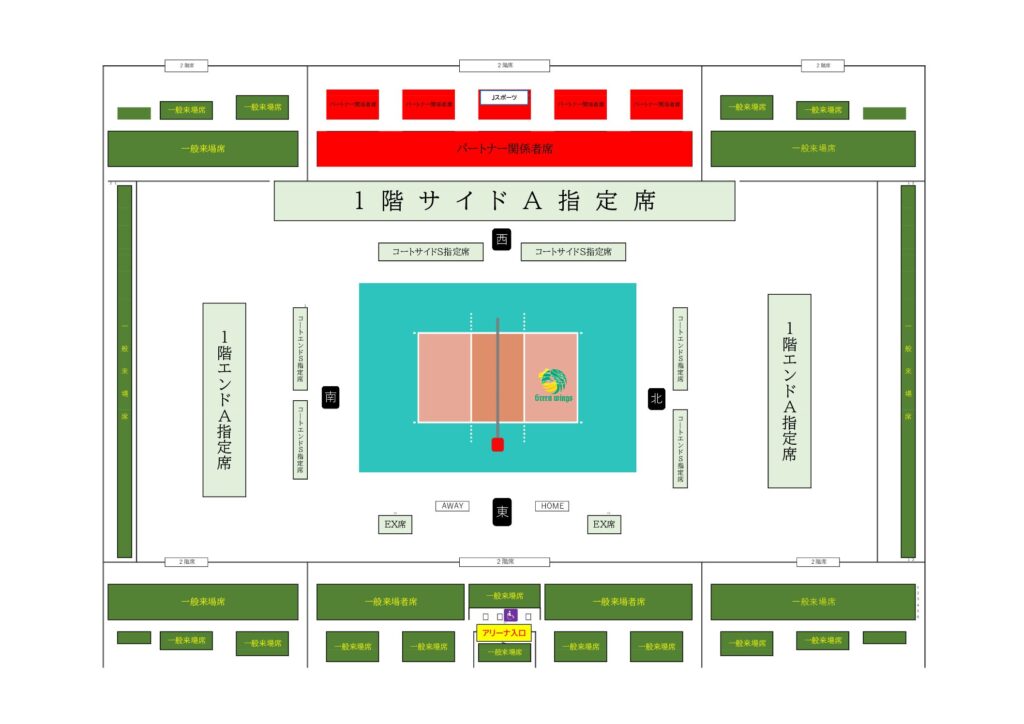 高崎アリーナで開催される対クインシーズ刈谷戦においては、2階席西側(赤色部分)は、パートナー関係者席とさせていただきました。一般来場者の皆さまは、会場案内図をご参照の上、グリーン部分の観客席でご観戦応援をお願いいたします。