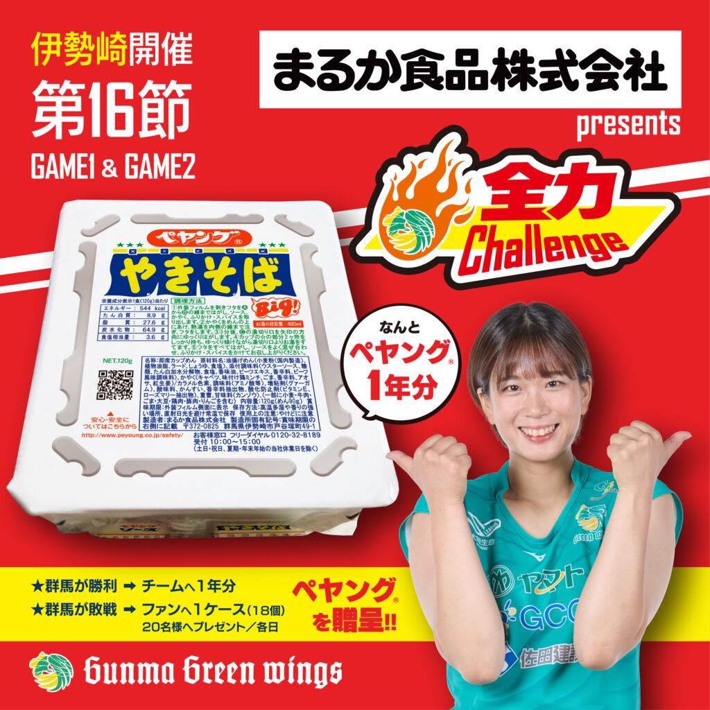 第16節で群馬グリーンウイングスが勝利すると1年分のペヤングをチームがGET!