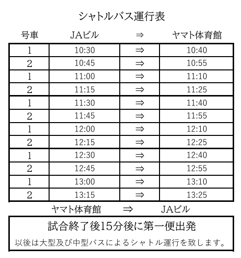 JAビル🔛ヤマト市民体育館間のシャトルバス運行は下記予定表をご参照ください。