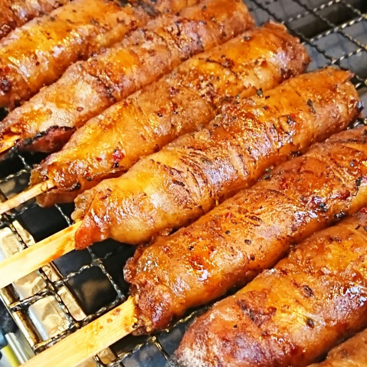 肉巻きおにぎり串(BBQ味)も超強力バーナーを使い外はカリカリ、中はふっくらに焼きます。